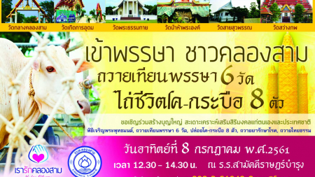 ขอเชิญชาวคลองสามและสาธุชนคนใจบุญทุกท่าน ร่วมสร้างมหากุศลอันยิ่งใหญ่ สั่งสมเสบียงบุญ ถวายเทียนพรรษา...