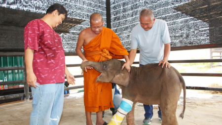 สวนนงนุชช่วยลูกช้างป่ารอดจากการได้รับบาดเจ็บถูกอาวุธปืนยิง และถูกบ่วงสลิงพรานป่า