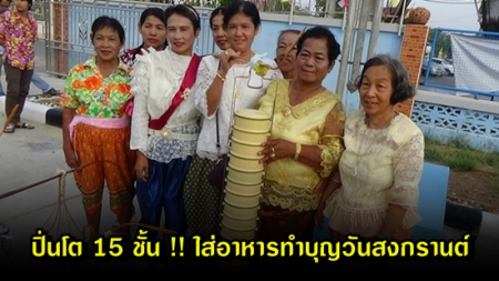 ฮือฮา ปิ่นโตสูง 15 ชั้น ใช้คานหางหงส์หาบใส่อาหารคาวหวาน ไปทำบุญวันสงกรานต์ที่ผ่านมา