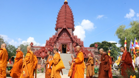 ชาวพุทธไทย-กัมพูชา ร่วมเวียนเทียนรอบมณฑปหลวงปู่สรวง ในวันวิสาขบูชา