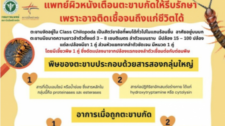 แพทย์ผิวหนัง เตือนผู้ที่ถูกตะขาบกัดควรรีบไปพบแพทย์เพื่อรับการตรวจรักษา เพราะอาจมีความเสี่ยงจากการติด...