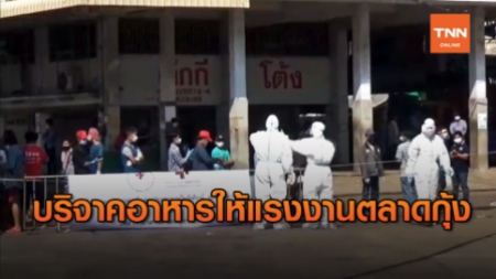 ผู้ว่าราชการจังหวัดสมุทรสาคร นำหน่วยงานลงพื้นที่มอบอาหารให้แก่แรงงานต่างชาติที่ถูกกักตัว บริเวณตลาดก...