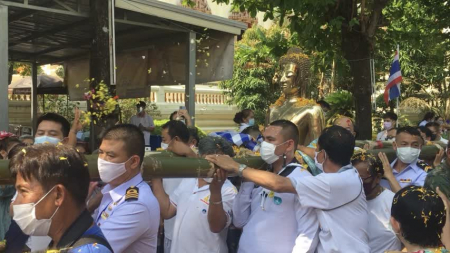 หนองคาย พุทธศาสนิกชนร่วมโปรยดอกไม้ แทนการสรงน้ำองค์หลวงพ่อพระใสขณะแห่รอบพระอุโบสถ 3 รอบ เน้นลดคนแห่...