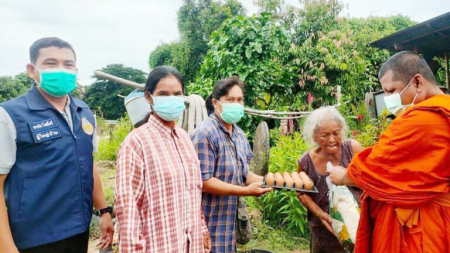 เจ้าอาวาสวัดเถรพลาย อ.ศรีประจันต์ จ.สุพรรณบุรี ร่วมกับชาวบ้าน ออกเยี่ยมมอบสิ่งของ แก่ผู้สูงอายุและบุ...