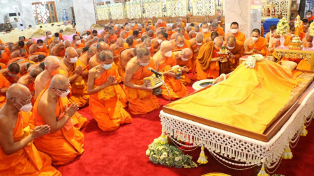 เคลื่อนสรีระ “สมเด็จพระมหารัชมังคลาจารย์” ถึงวัดปากน้ำฯ แล้ว คณะสงฆ์-ศิษย์ ร่วมสรงน้ำแน่นวัด